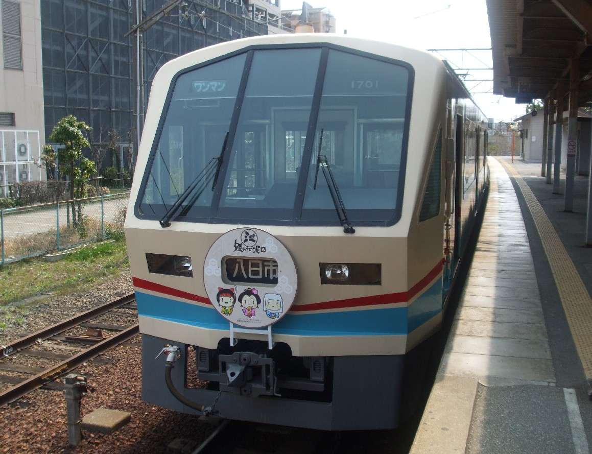 13:40、近江鉄道で八日市駅へ。電車が当りです。大河ドラマ「江」の影響でヘッドマーク付きです。個人的に何が当りかと言うと、この車輌だけクロスシートで乗り心地が良いのです。あとはすべてロングシートの古い車輌。ラッキーです。寝不足には助かります。