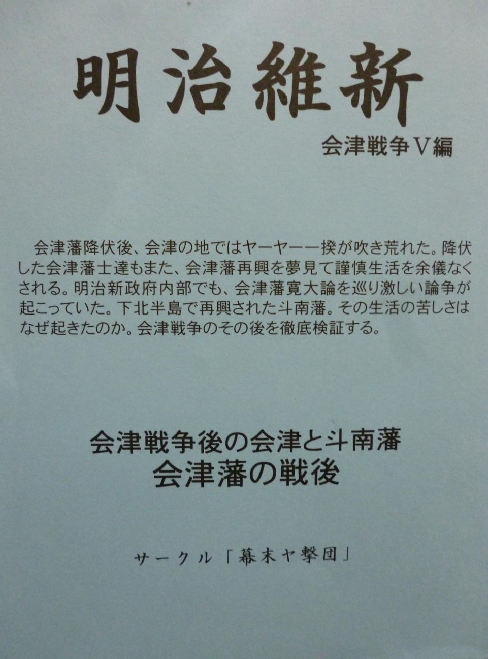 先月いただきましたヤ撃団の冊子です。明治維新会津戦争Ⅴ編です。一応これが最終作ということで、降伏後の会津が中心に編纂されています。最初の梅原さんの作品は読んでいたので大山格(いたる)さんの編から。会津藩については心情史観というのか、どうも贔屓が目立ち過ぎて本当の会津事情をつかめないところがあります。各人の切り口を面白く読ませていただきました。ただ斗南藩の件については民衆史観に立つか、藩政史観に立つかによって善悪が分離すると思います。また、明治3年に斗南移住をする際に実は東京移住組がすでに斗南へ行く前から脱走していたりします。こうした人物は会津藩の庇護を受けないために「平民」ちなって東京で過します。それらの方々が明治20年代になって士族復帰を行ったりします。