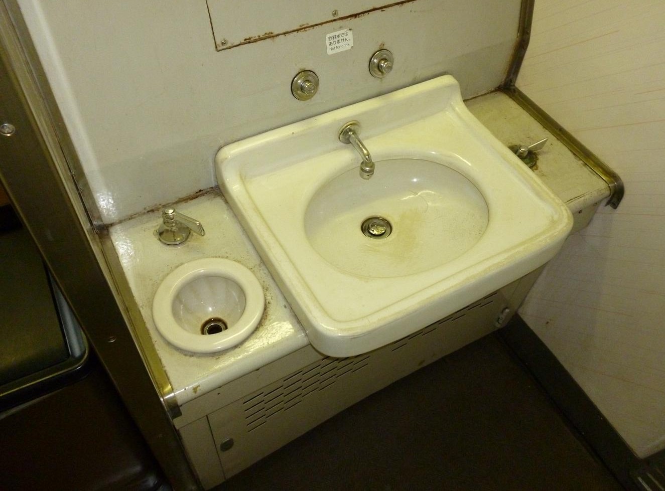 古い名残は洗面所でわかります。左側にあるのは痰壷です。試しにレバーを引いたら現役でした(汗)なお、鈍行なのでお湯はでません。