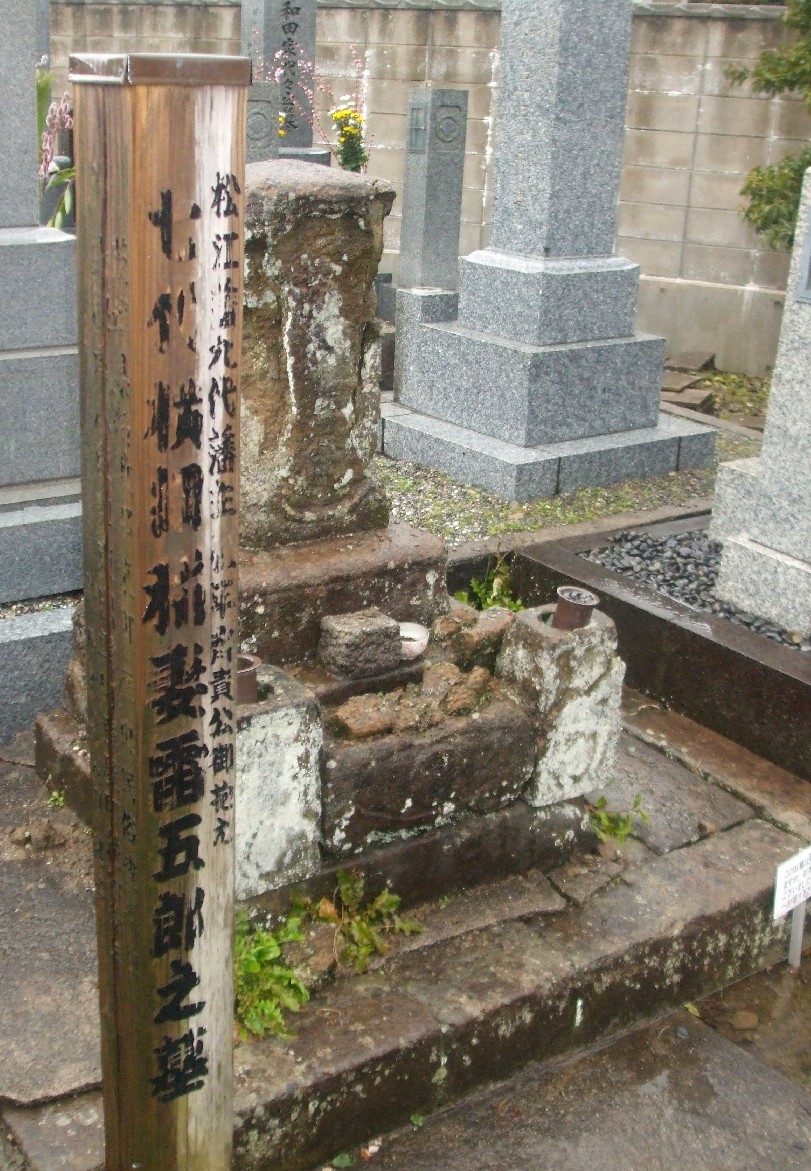 この高架脇にあるのが誓願寺です。千葉十太郎の養子となった千葉東一郎の実父、稲妻雷五郎の墓所があります。渋谷の寺院が本来の寺院ですが、稲妻雷五郎は松江藩に召抱えられた関係で松江藩士でも系統があるので、こちらは分骨されています。墓所は寺の向かい側、高架を超えたところにあります。