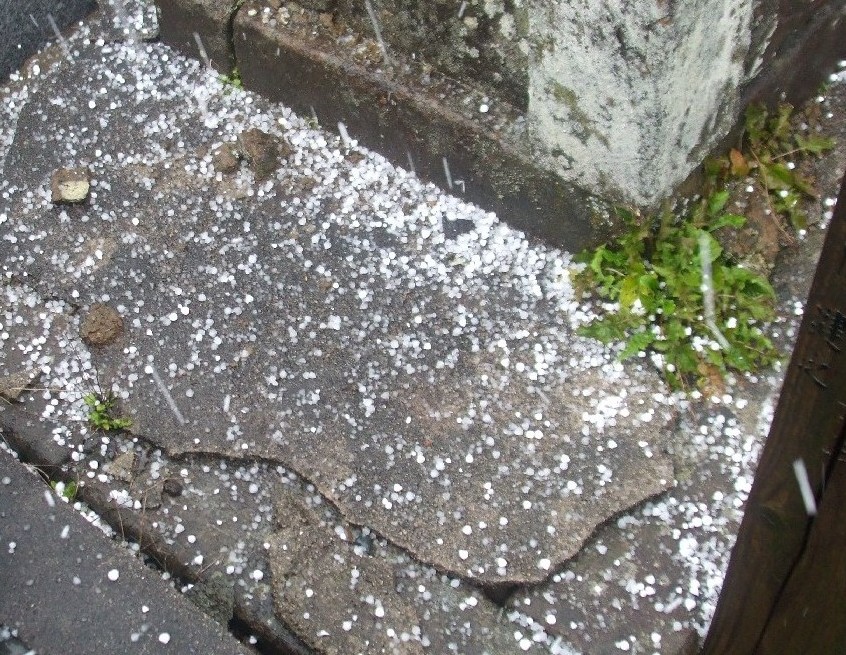 このとき、強烈な霰が轟音とともに降ってきます。画像に霰の流線が写っているとともに、下の丸いのが霰です。これからどんどん積もっていきます。霰が積もる姿を見るのは生涯初めてです(汗)。