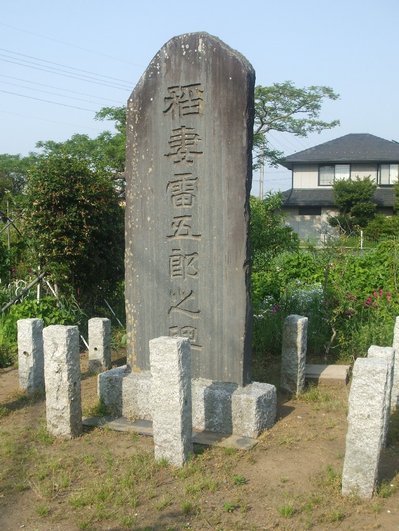 まずは稲妻雷五郎の碑です。第七代横綱、稲妻雷五郎を称えるために大正時代に建立されました。ここの裏面に根本金太郎の名前があります。千葉家に養子入りしている時代は「千葉東一郎」。郷土資料館に養子一札が残っています。しかし、この碑面を見る限り、千葉周作に習ったことになっています。金太郎さんの存命のころでしょうが、本人が碑面を確認したかは微妙です。