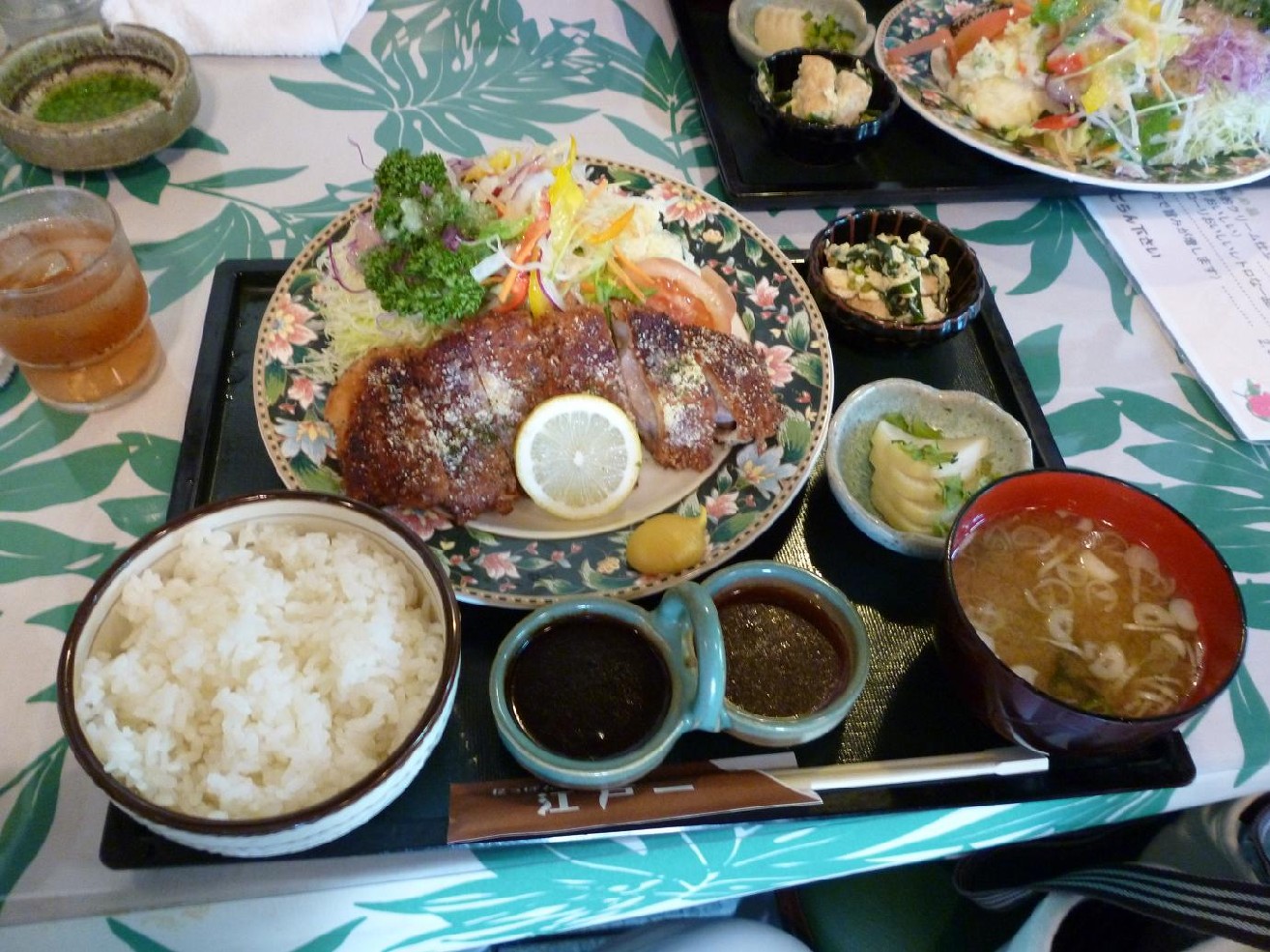 13:30、食事をご馳走になりました。洋食屋で、焼きとんかつ定食です。とんかつを焼いています。2種類のタレを用いていただきます。野菜がたっぷりで美味しくいただきました。