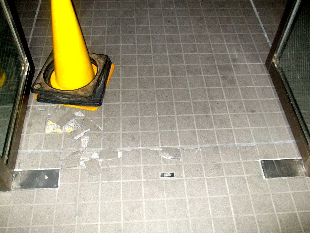 また、少々古い建物は外壁が割れ、道路のアチコチに破片が散乱しております。