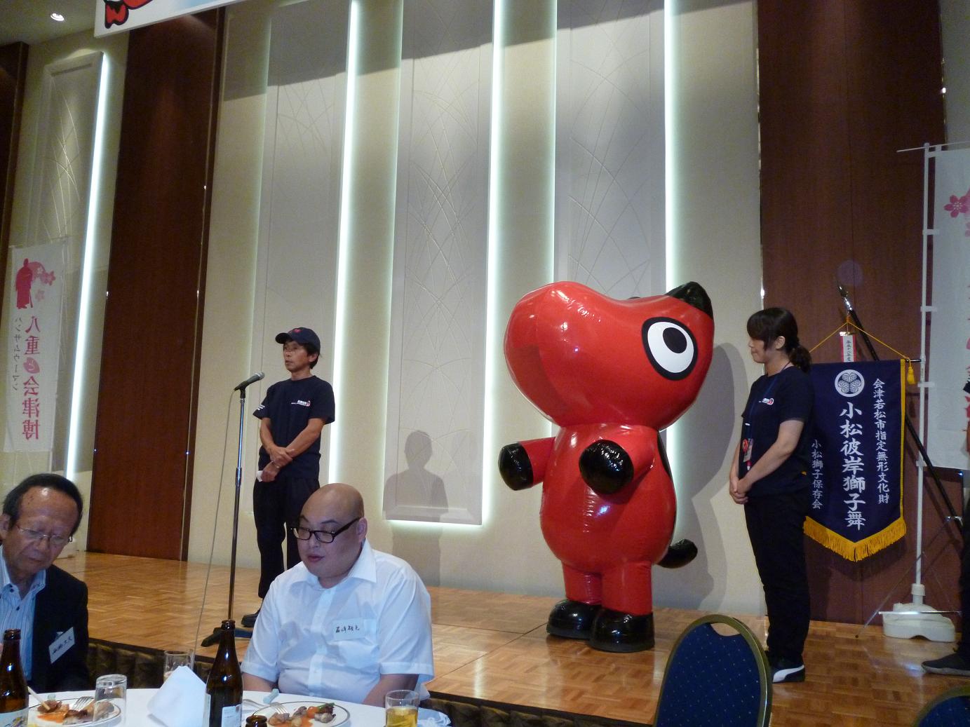 この会は会津の食材を楽しむことがメインで、それにちなみ、各種催しが行われております。そのひとつが「赤べえクン」ですが、この着ぐるみは大変そうです。エアーで膨らんだ着ぐるみのなかに人間が入っており、息をするのも苦しそうです。歩くとドラえもんみたいで客側から見ると面白く拝見できました。