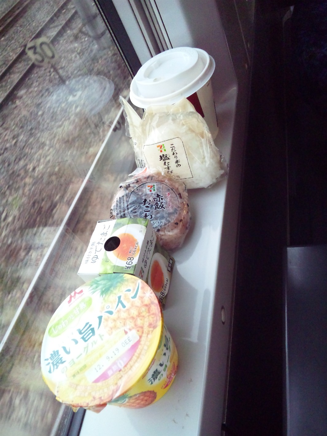 6:49、快速ラビット号に乗車。本日の朝食はコンな感じ。セブンイレブンのイシちゃんの七穀米おにぎりが発売終了だったので銀しゃりと赤飯です。