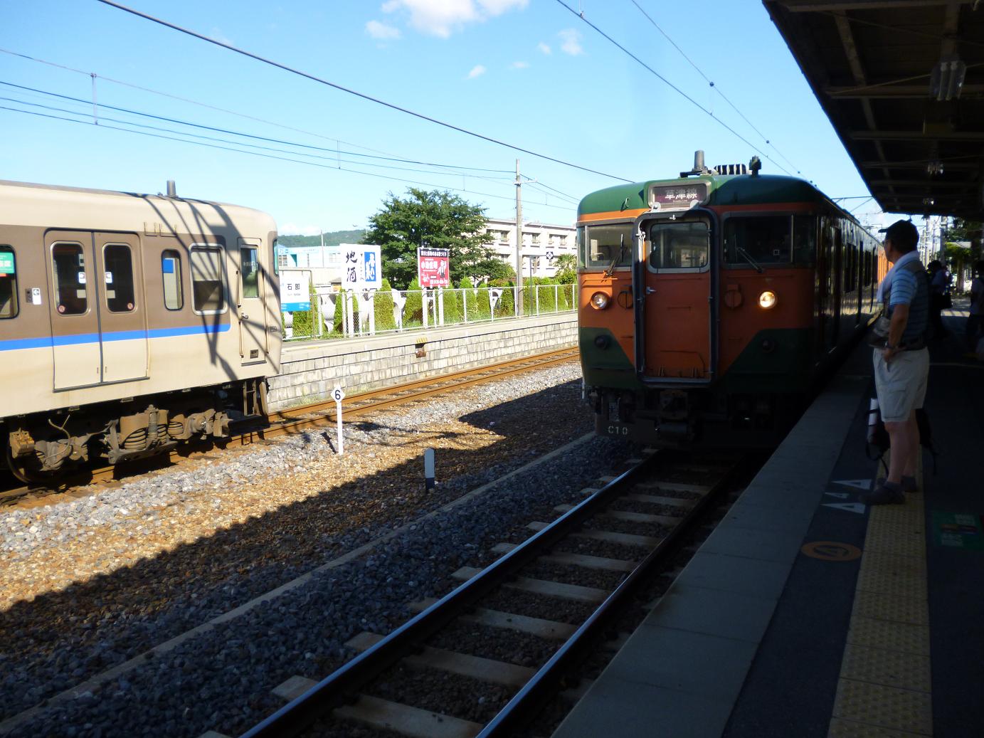 15:36、草津線に乗車。懐かしい湘南カラーです。古いから、その分揺れます。