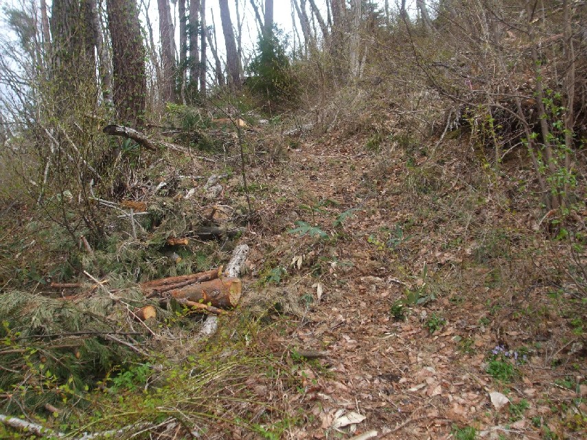いったん奥まで進むと行き止まり風な感じになります。しかしよく見ると左手に伐採の跡が存在します。林業のために出来た道なのか、土石流の跡なのか迷うような道?ですが、急な坂道を登ってみます。