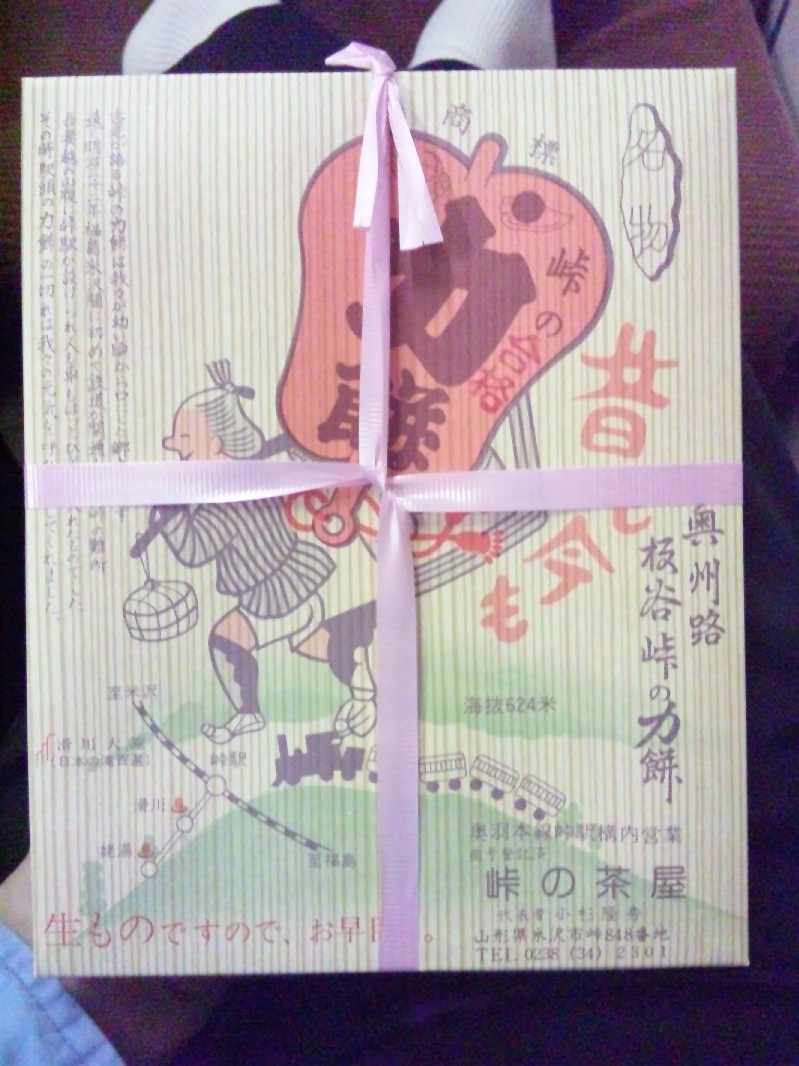 これです。1月の旅行の際、見知ったのですが、途中の峠駅では立ち売りの方がおりまして、奥羽本線開業より販売している「峠の力餅」を販売しています。これは知る人ぞ知るお土産で、米沢寄りドア付近におり、皆我れ先と買い漁ります。便利なことも手伝い、料金は1,000円也。お釣りが出ないようにした方が顰蹙を買わずに済みます。なにせ1分も停車しませんから。