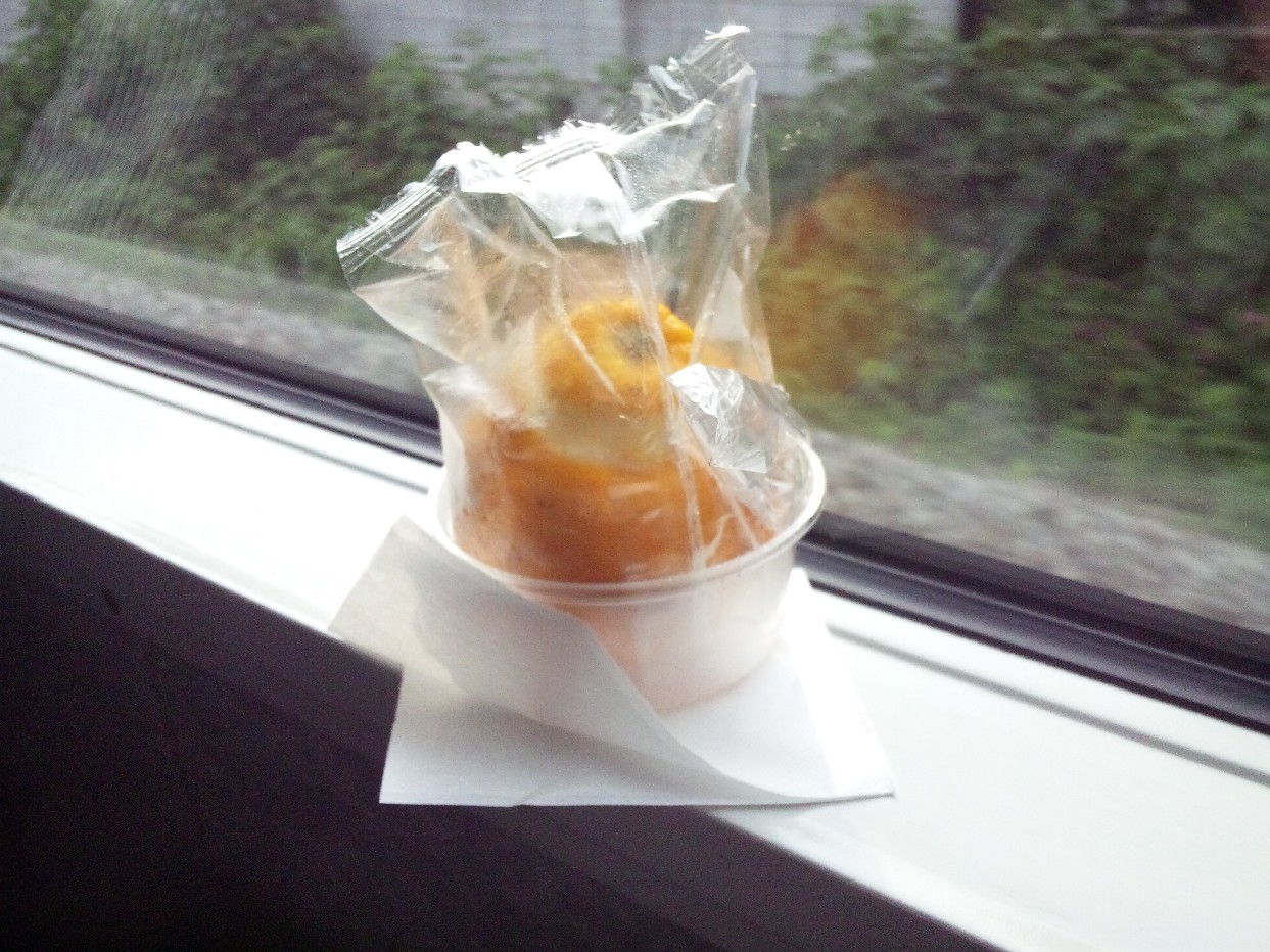 で、ロマンスカーと言ったらコレです。オレンジシャーベット。永年の伝統です。本物のオレンジをくり抜いて、中にシャーベットが入っています。