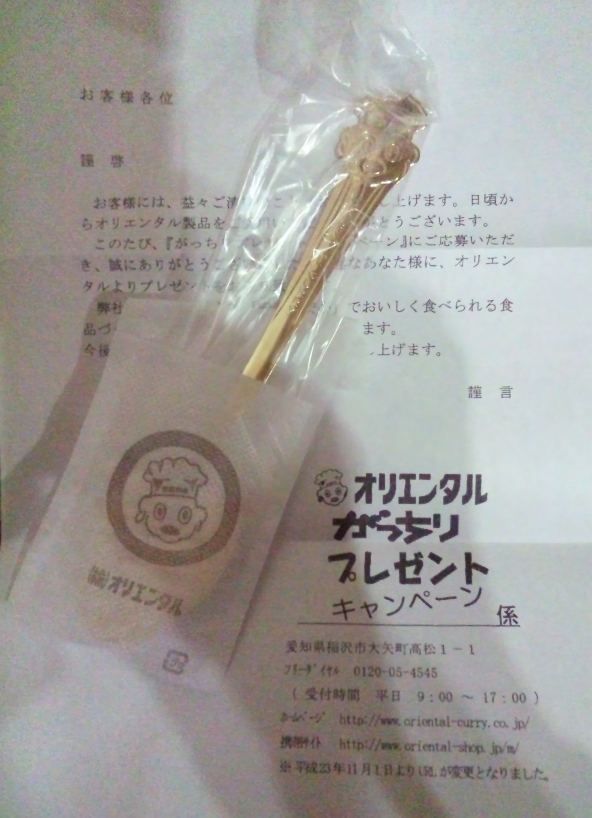 コレです。なんと金のスプーンが当たりました!電柱じゃないですよ!金(メッキ)ですよ!