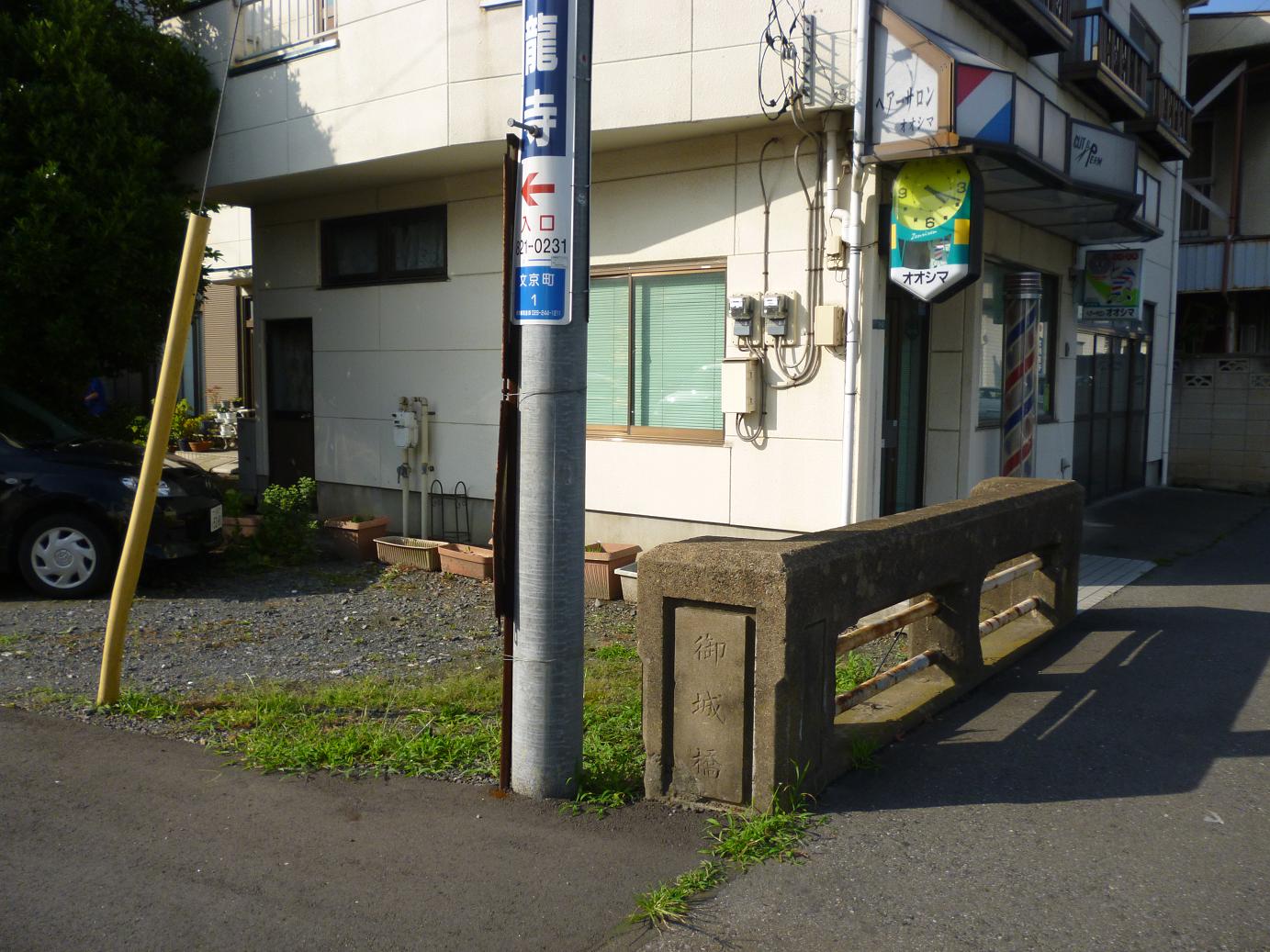 その途中で見かけたのがコレ。昔は掘があったようですが、いまはコンな状態です。この先が三の丸橋ですが、掘の遺構は橋以外見出せません。それでも名称の通り、理髪店側が旧三の丸だったことはわかります。