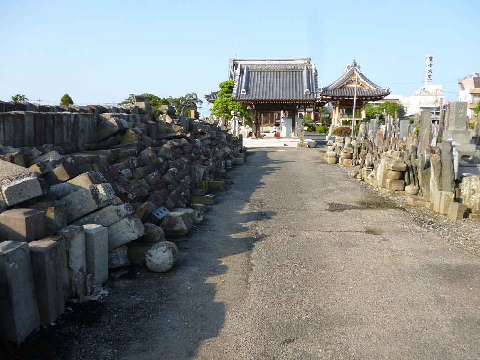 ここからグルっと回って神龍寺に参りました。無縁墓は震災の影響でドミノ状態になっていました。ほかにも史跡扱いの豊川稲荷社が粉砕され、整地されており、ほかにも檀家墓所での石組みは多く破壊されています。山門の一部だけは最近復旧したらしく、柱の白さが目立ちます。