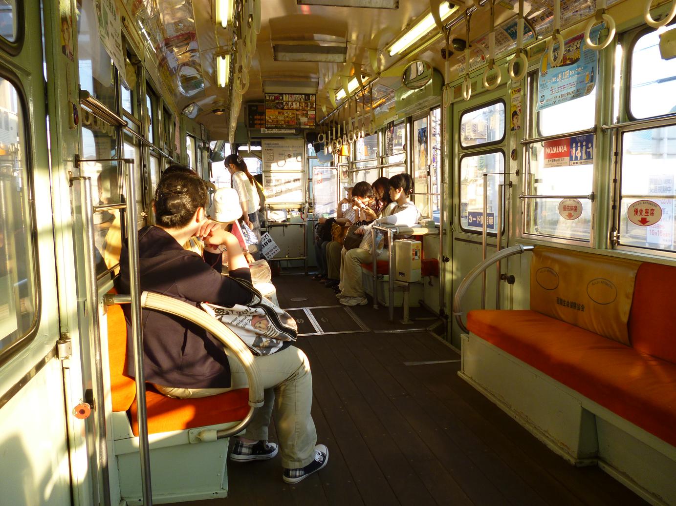 やって来た市電に乗車します。いやはや、たぶん40年以上前に製造されたものでしょう。冷房って何?みたいな、扇風機さえない車内に頑丈そうな鉄骨ボディが印象的です。