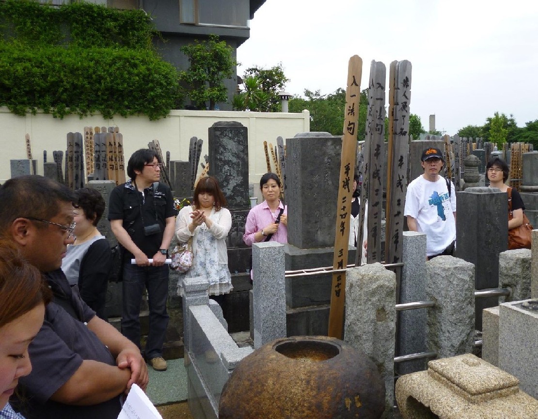 最初は豊島園駅を降りてすぐにある田島十二ヶ寺墓地へ。3ケ所巡り、参加者に焼香していただきました。画像を見ると、左側の人物が目前にある石を持ち上げられるかどうか悩んでいる姿に見えますが、一応、皆様説明した後に焼香待ちか、焼香後に見つめているかの図です(笑)
