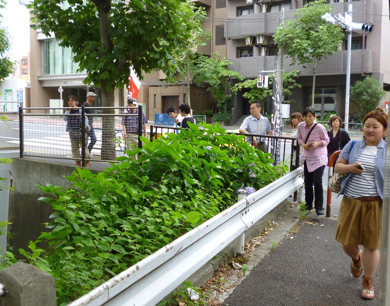 そして、再度豊島園駅に戻り、大江戸線に乗車し、国立競技場駅に到着。エレベーターで昇り、再度坂を降りて、まずは玉川上水余水川の遺構を見学していただき、その後、沖田総司逝去の地を案内しました。偶然のいたづらである程度特定できたのは幸いです。
