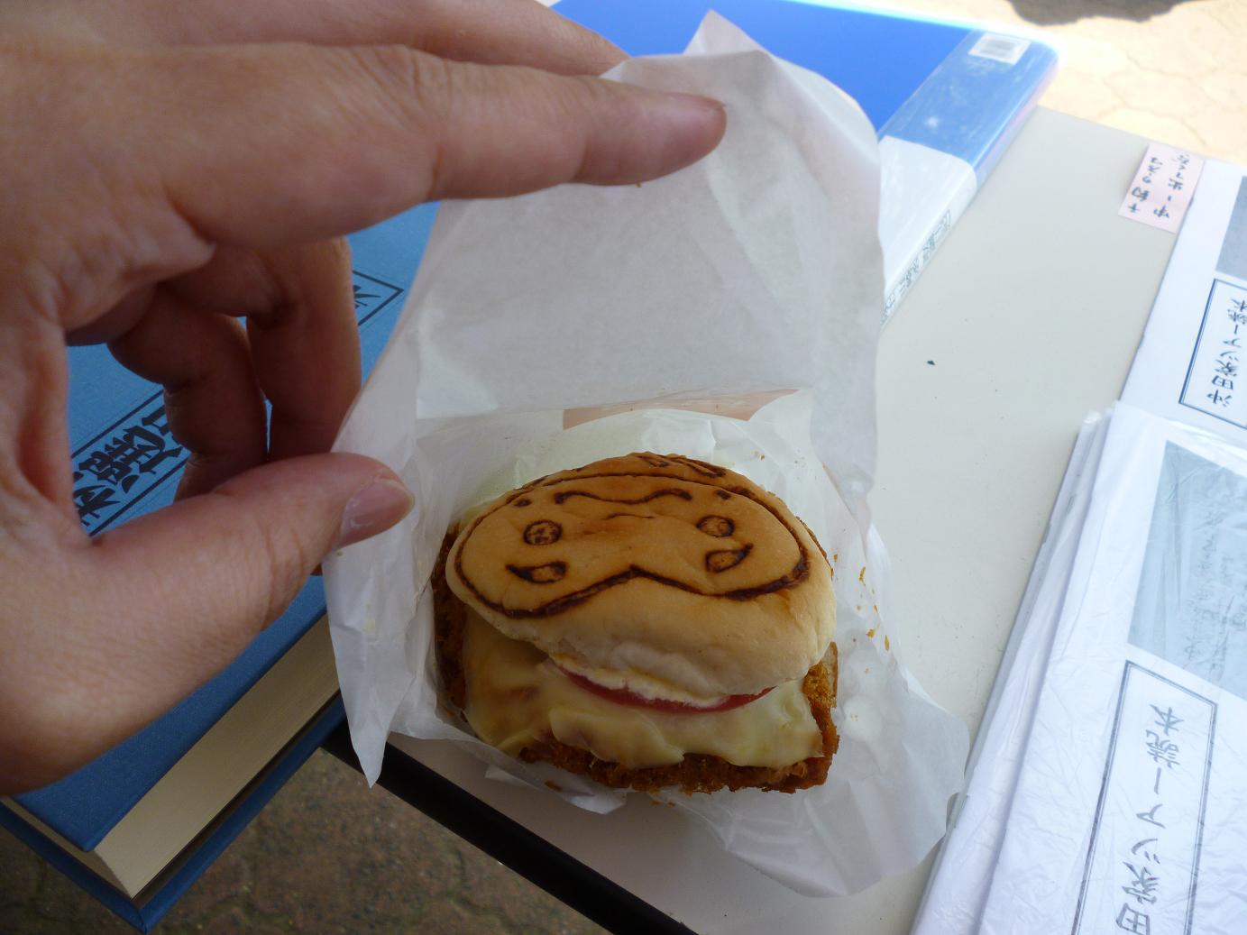 ここで、先に売り切れては大変と、仲間が白河バーガーをGETしてくださいました。ハート型にだるまをモチーフとした焼印、そしてトンカツ、トマトといった内容で美味しくいただきました。