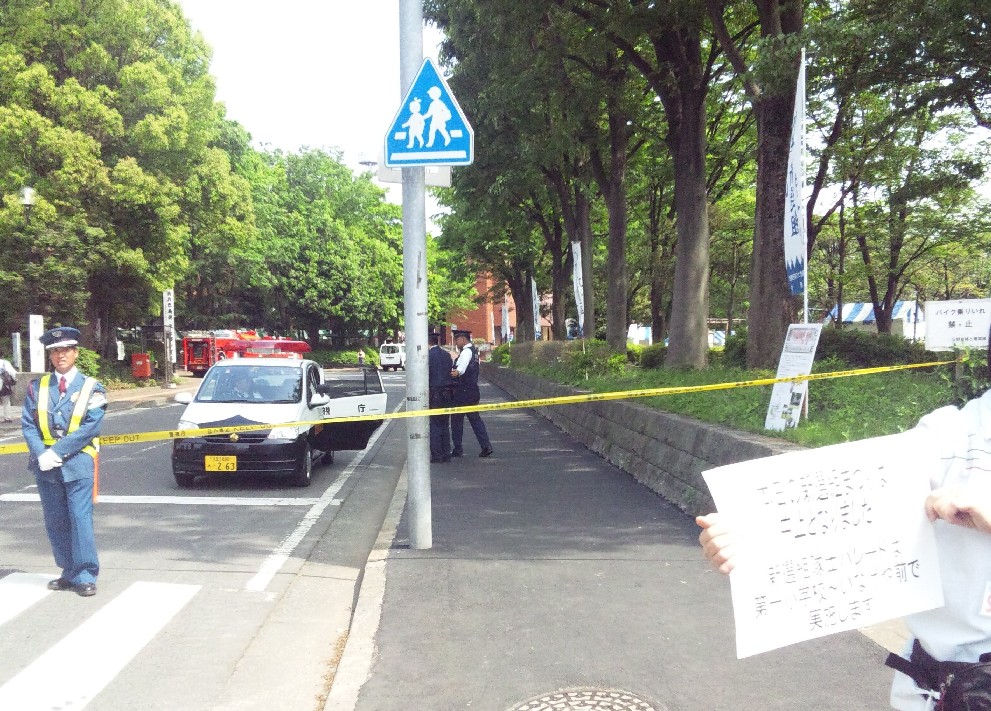 早速会場周辺には警察によって封鎖を示すテープが張られ、張られた後は封鎖場所には警官が、封鎖テープ周辺には警備員が、その手前に市の職員が即席で作った中止のビラを持って、見学目的の方々にさんざんお叱りを受けていました。可哀想に。