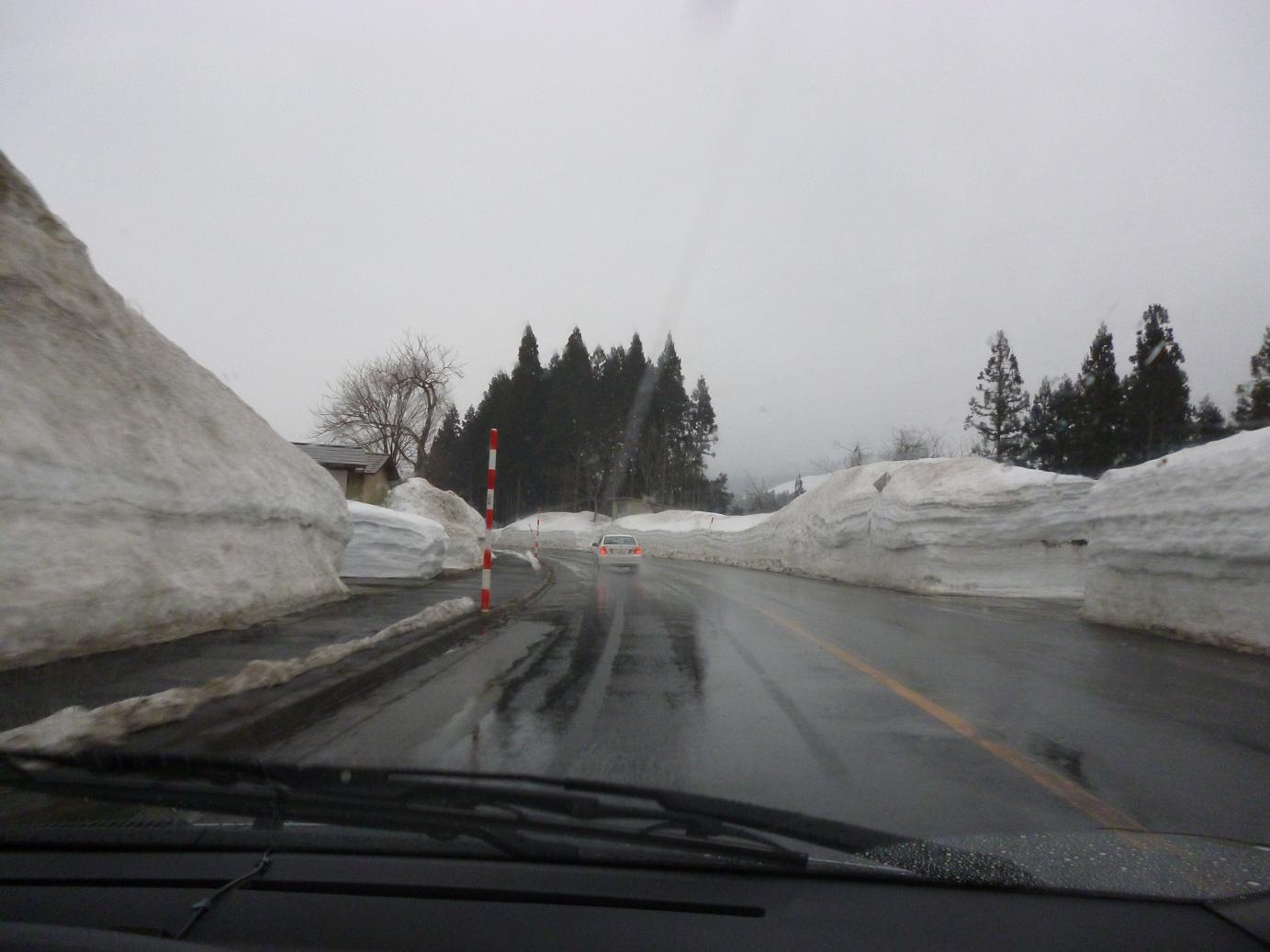 18:30、同所を辞去。外は雨。峠は雪。少し溶けてますが雪はまだ多いと思います。道路の舗装も消えて2車線なのか1車線なのか分かりません。
