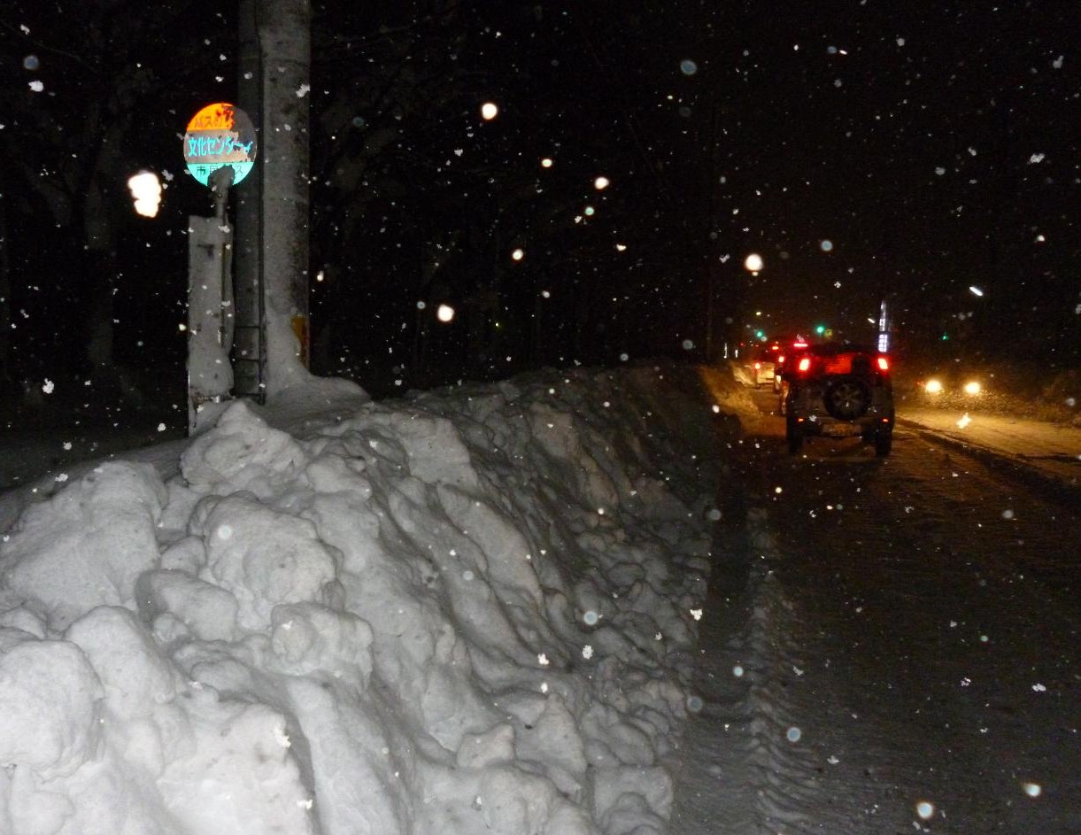 そうして遅れに遅れてバスが到着したのは18:20。除雪車と雪道でデコボコしてるので走行してても速度メーターの針が動かないほどのスピードで移動することもしばしば。豪雪恐るべし!