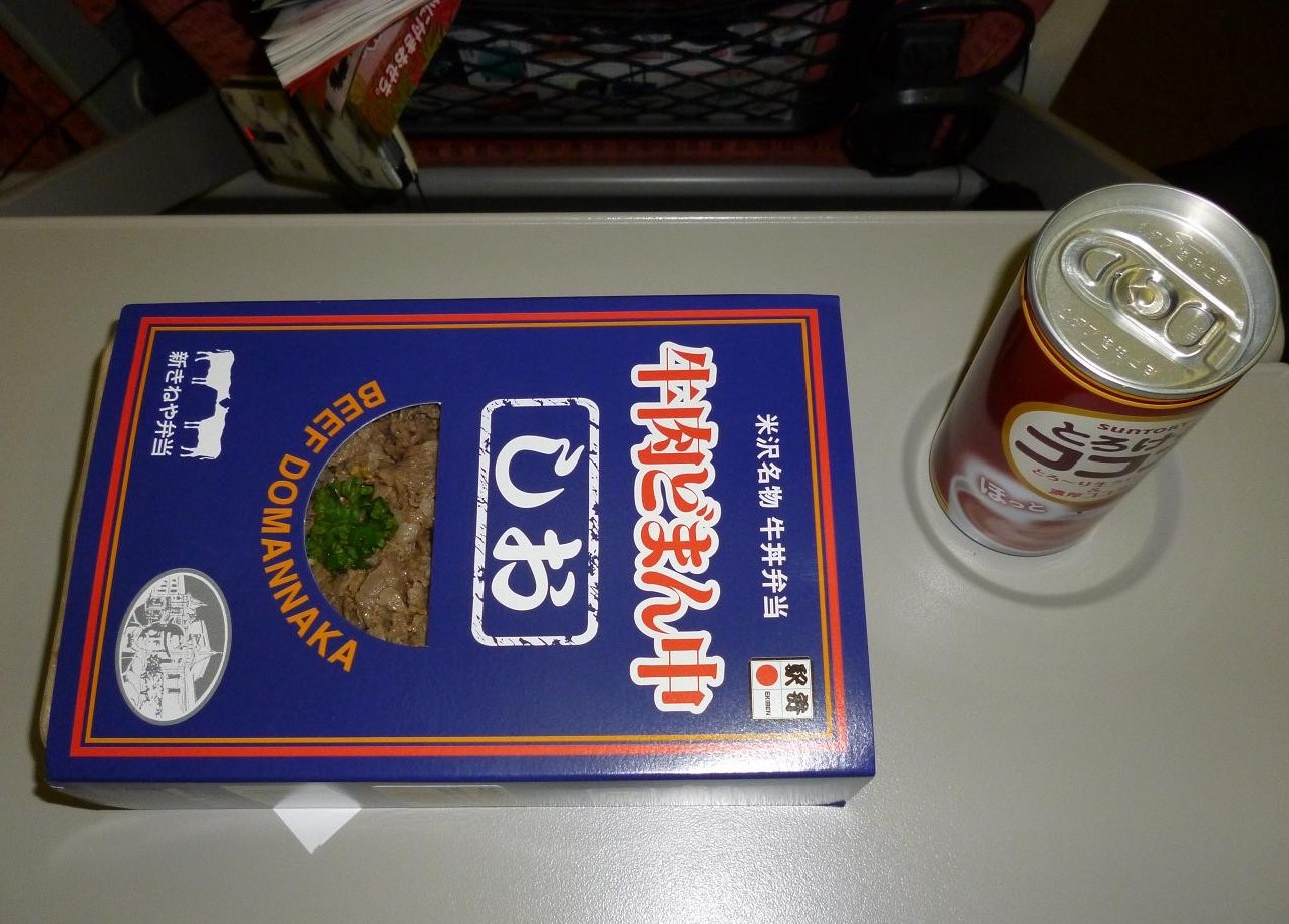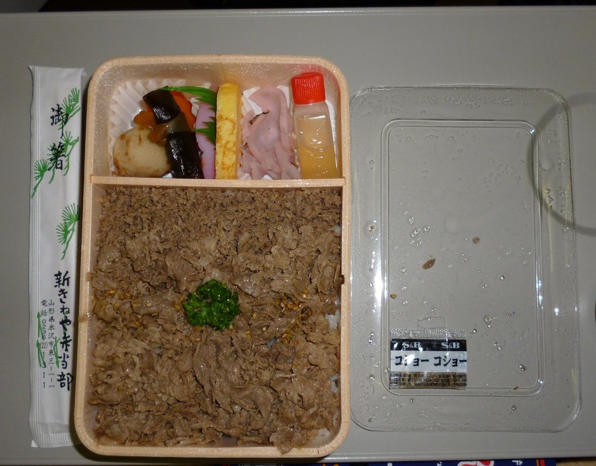 米沢駅弁で有名な「牛肉どまん中」の塩バージョンです。駅の売店で温めていますのですこし身体にエコです。