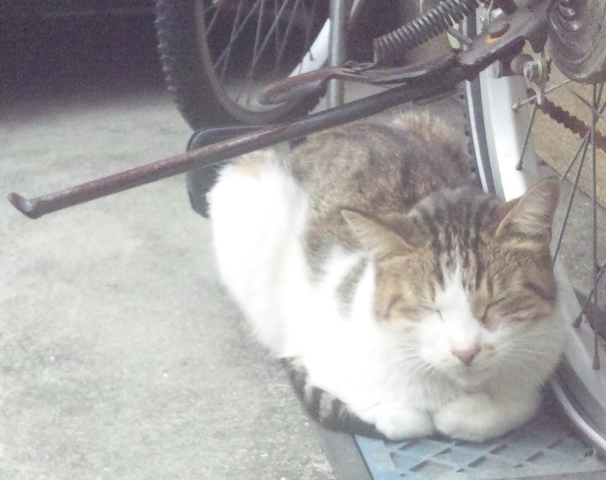 通りがかりのネコです。実は狸寝入りです。触ろうと思えば触れます。見るのが好きなので写真をパチッ!御礼にまたたび攻撃。またたびをあげたらドコかしらからほかのネコも登場しましたが、それは立ち去ったあとなのでどうなったでしょう。